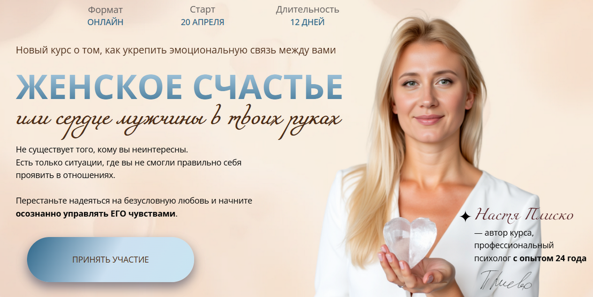 Этот курс необходим для женщин, которые планируют серьезные отношения с мужчинами, а так же для тех, кто уже создал семью и хочет в ней мира, покоя и процветания.
