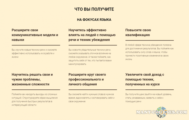 ЧТО ВЫ ПОЛУЧИТЕ НА ФОКУСАХ ЯЗЫКА Расширите свои коммуникативные модели и навыки Вы изучите новые техники речи и сможете эффективно использовать их в работе и жизни Научитесь эффективно влиять на людей с помощью речи и техник убеждения Вы освоите убедительные техники речи, сможете оказывать этичное влияние на любое окружение. А также поймете, как защитить себя от тех, кто пытается вами манипулировать Повысите свою квалификацию В любой сфере техника убеждения полезна для достижения результатов. Вы поймете как использовать силу слов и языка, чтобы принести позитивные изменения в свою жизнь Научитесь решать свои и чужие проблемы, жизненные сложности Поймете как находить выходы из сложных ситуаций. Структурируете образ мышления для получения быстрых результатов в интересующей области Расширите круг своего профессионального и личного общения Вы сможете найти нужные слова в нужное время, вдохновлять и мотивировать себя и свое окружение Увеличите свой доход с помощью техник, полученных на курсе Вы получите шанс выйти на новый уровень, стать узнаваемым, заявить о себе с помощью речи