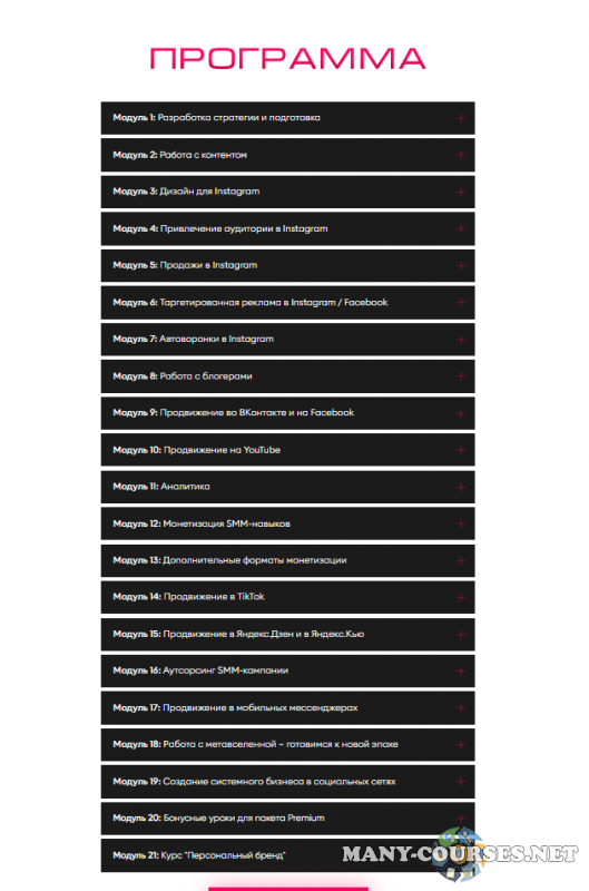 Регистрируем, выбираем формат, внедряем продающие элементы Приручаем умную ленту: повышение охвата постов Делаем аккаунт ярким: техники оформления визуала. Дизайн для Instagram Создаем маски в Instagram Работаем с хэштегами и геотегами Продвигаем канал в Instagram: конкурсы, марафоны, внешнее продвижение Продвигаем канал в Instagram: вывод в рекомендации, работа с хэштегами, Автоматизируем работу: ключевые сервисы для Instagram