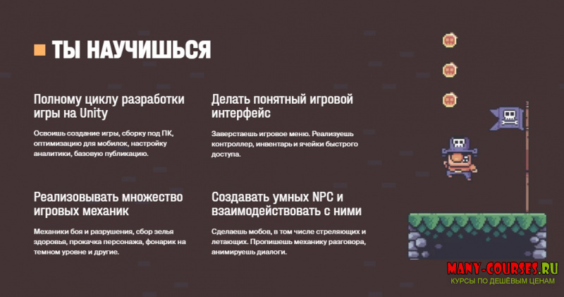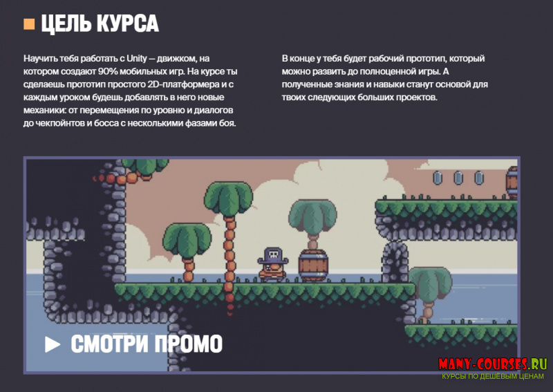 ЦЕЛЬ КУРСА - Научить тебя работать в Unity и самостоятельно создавать игры. Пройдя курс, ты сможешь реализовывать свои идеи для игр без посторонней помощи. Курс полностью построен вокруг проекта: все знания ты сразу применяешь на практике и сможешь использовать в своих следующих играх.