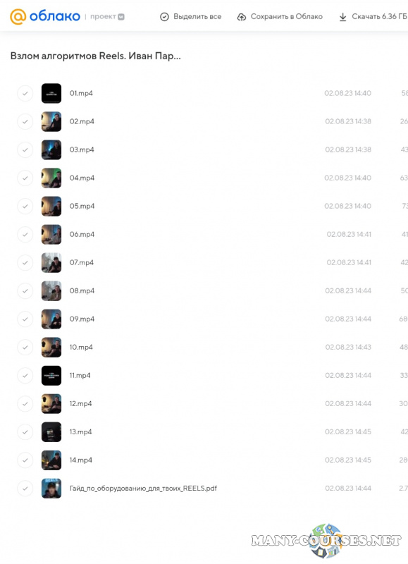 Артём Сенаторов - Кэмп по экспертным Reels. Тариф БазовыйИгорь Зуевич - Создай свой генератор идей для Reels (продающий контент-план на 1 год) (2023)Иван Зайцев - Чёрный грааль. РТСАртём Сенаторов - Гонка. Марафон по экспертным Reels. Тариф БазовыйЕгор Моняков - Reels оловка 5.0. Тариф Полный Маасдам