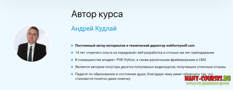 Автор курса: Андрей Кудлай / WebForMySelf Категория: Программирование Дата выхода: 2021 Продажник от автора: Перейти Цена у автора: 5970 P