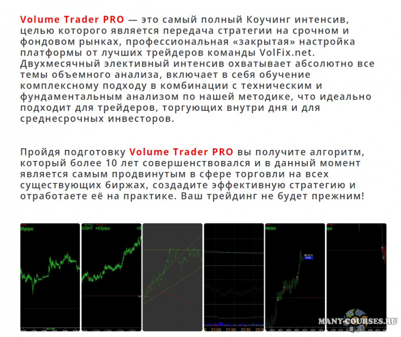 Volume Trader PRO — это самый полный Коучинг интенсив, целью которого является передача стратегии на срочном и фондовом рынках, профессиональная «закрытая» настройка платформы от лучших трейдеров команды VolFix.net. Двухмесячный элективный интенсив охватывает абсолютно все темы объемного анализа, включает в себя обучение комплексному подходу в комбинации с техническим и фундаментальным анализом по нашей методике, что идеально подходит для трейдеров, торгующих внутри дня и для среднесрочных инвесторов.