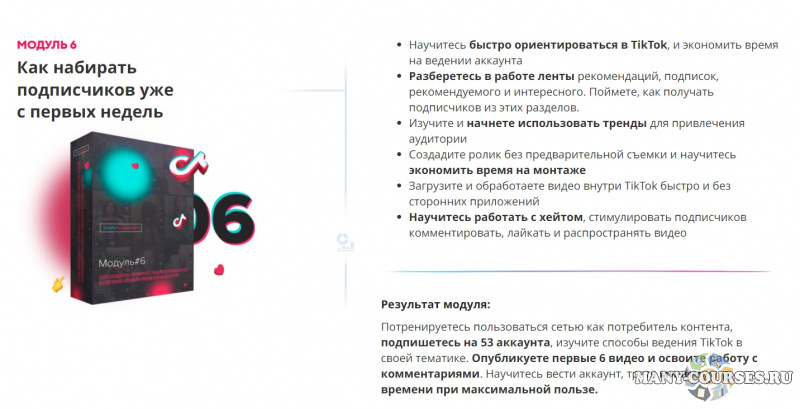 Результат модуля - Узнаете, как устроен TikTok, и как использовать его возможности для быстрого развития и монетизации вашей базы подписчиков.