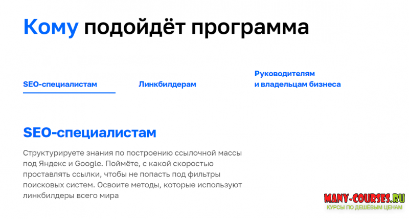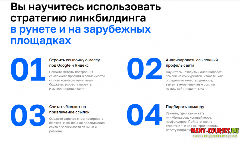 Структурируете знания по построению ссылочной массы под Яндекс и Google. Поймёте, с какой скоростью проставлять ссылки, чтобы не попасть под фильтры поисковых систем. Освоите методы, которые используют линкбилдеры всего мира
